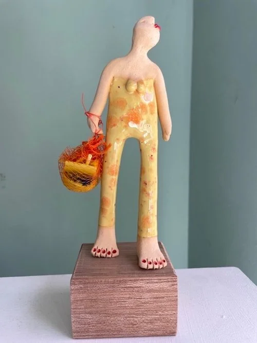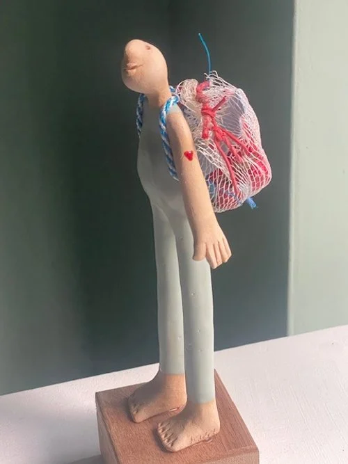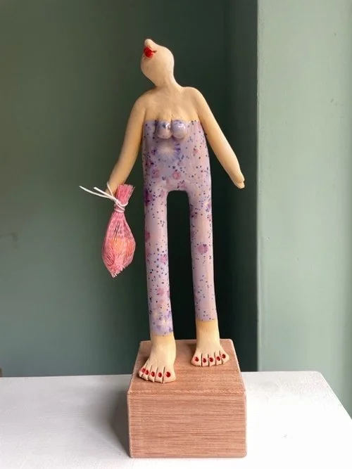 I also make beachcomber men and women. My search for plastic began on the beaches of the French coast. Back home, I began using my finds in various creations. Even now, during my daily walks with my dachshund Pom, I continue to hunt for brightly colored bits of plastic. The mesh bags that hold onions, lemons, or garlic become beachcomber sacks, carried by figures dressed in vibrant colors.