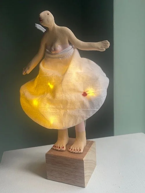 About twenty years ago, I started working with ceramics. Since then, I’ve created my own ceramic world full of little figures. Figures that dance, bring flowers, share meals, walk their crocodiles or dogs, and wear skirts that light up from within.